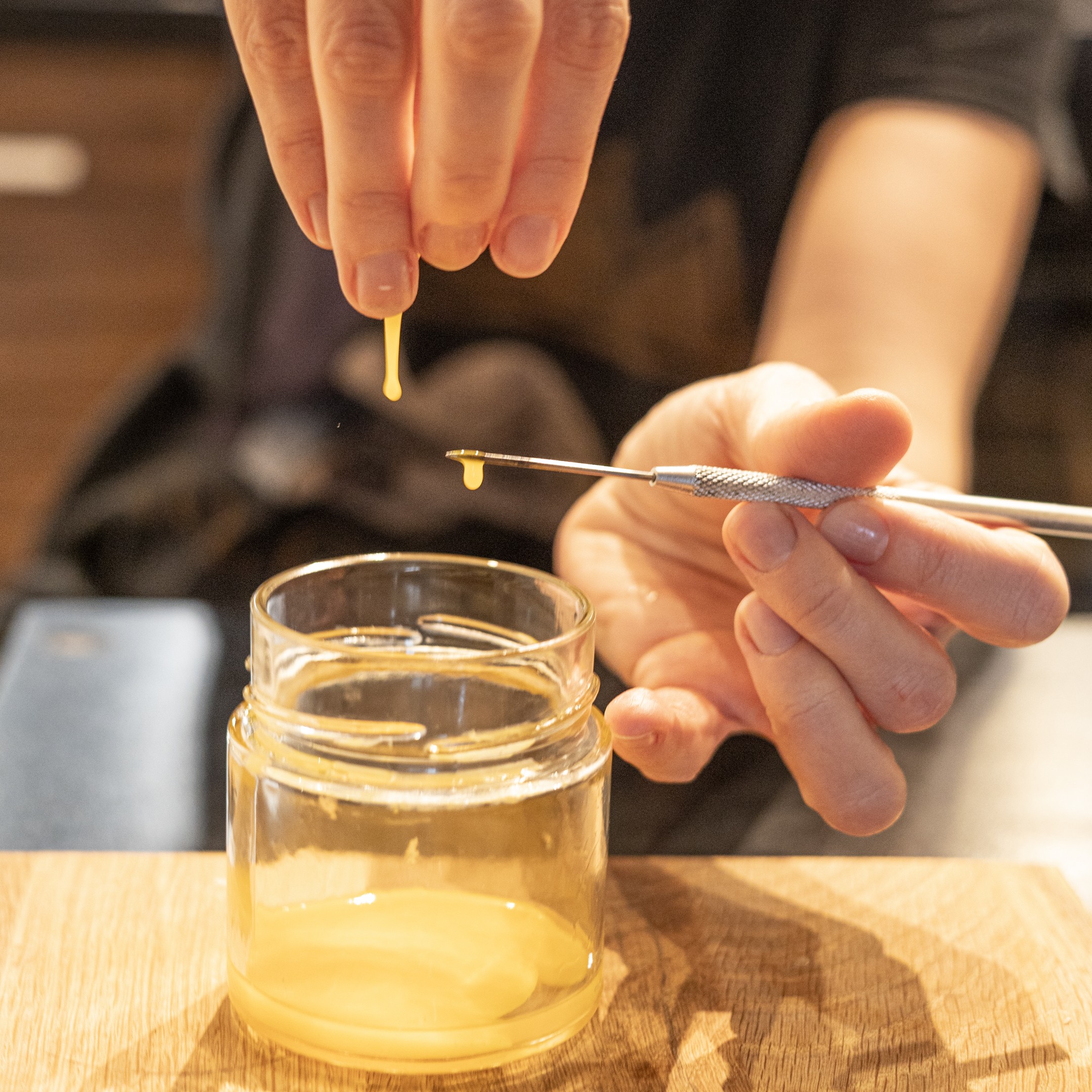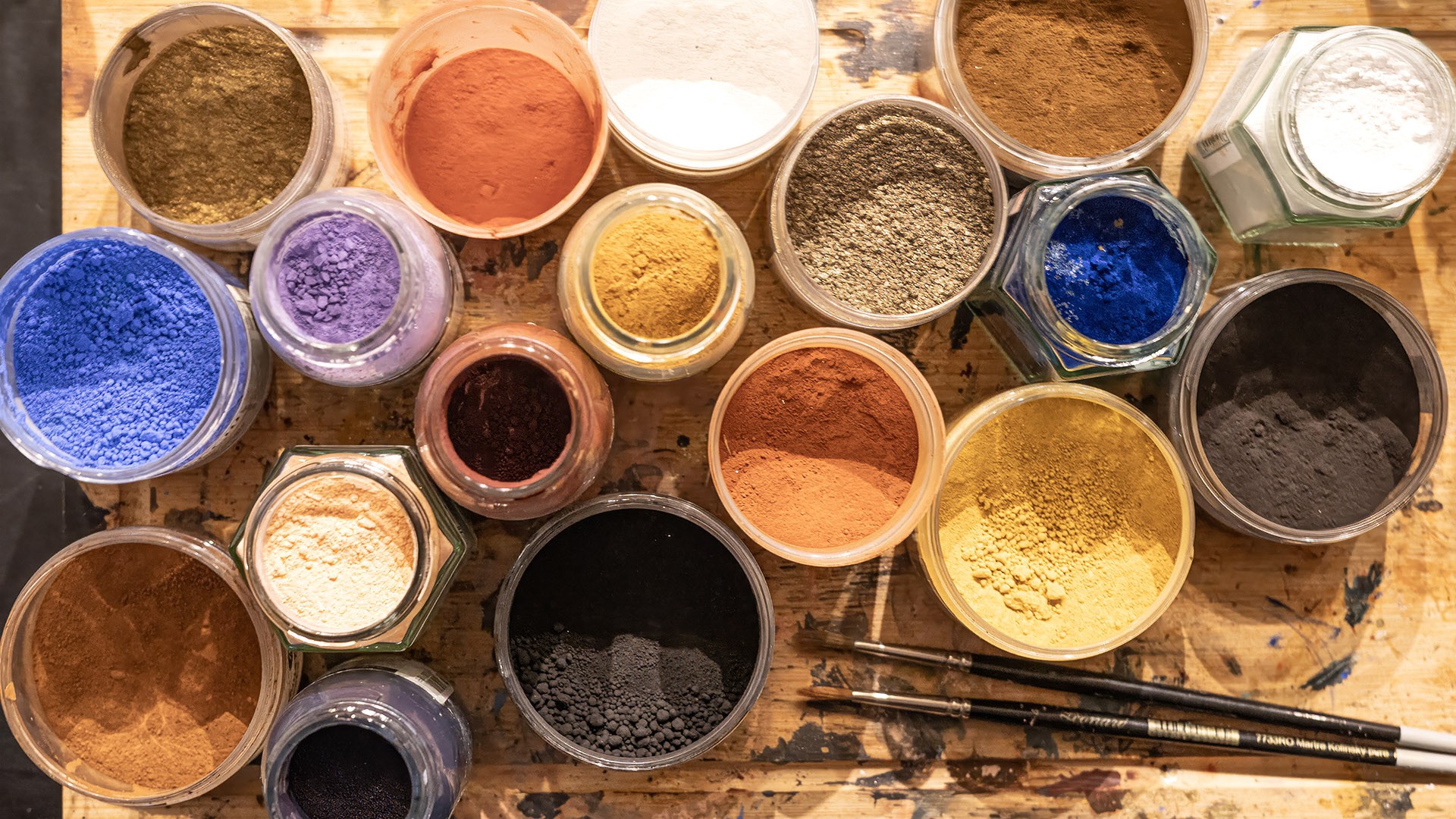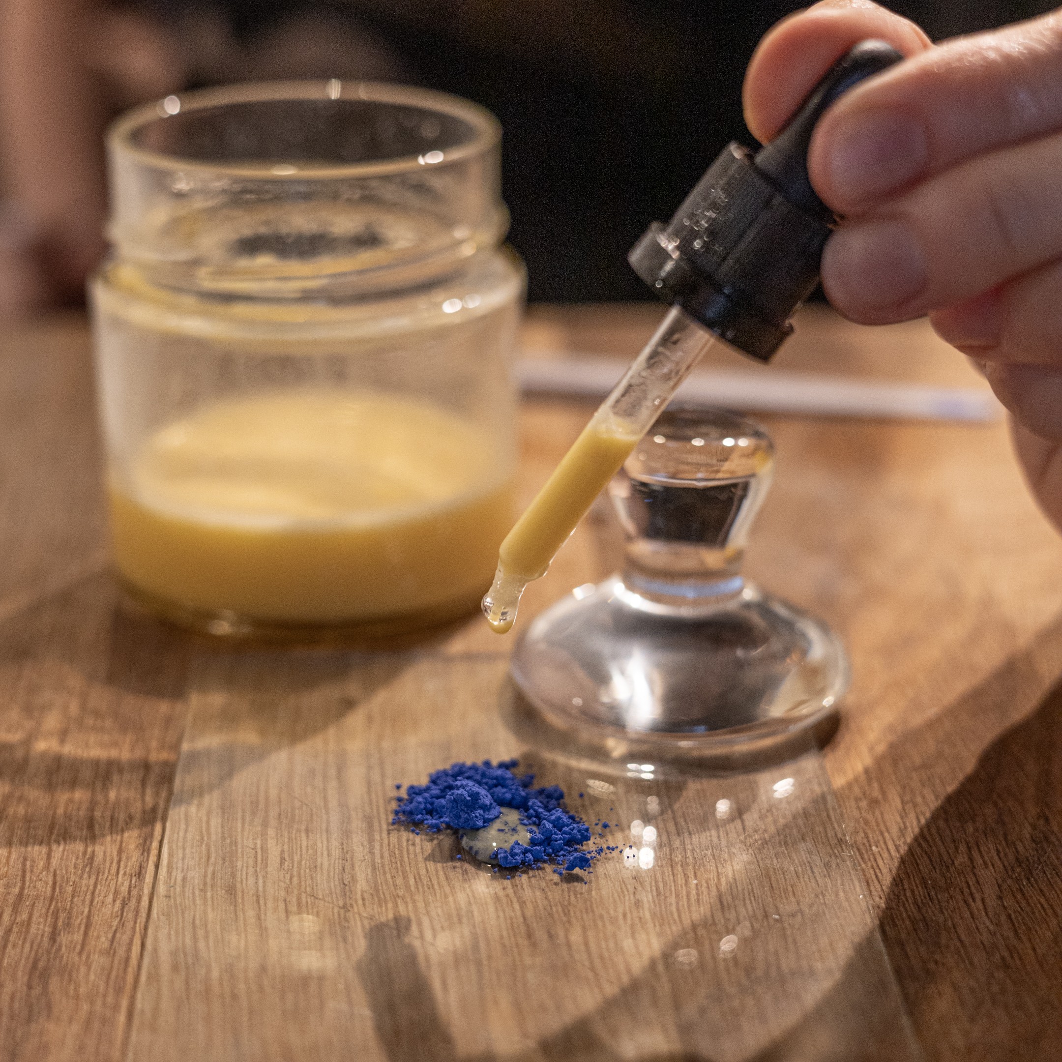 Farby przygotowuję sama, łącząc medium z suchym pigmentem, następnie rozdrabniam pigment specjalnym szklanym ucierakiem, zwanym kurantem, na szklanej płytce.